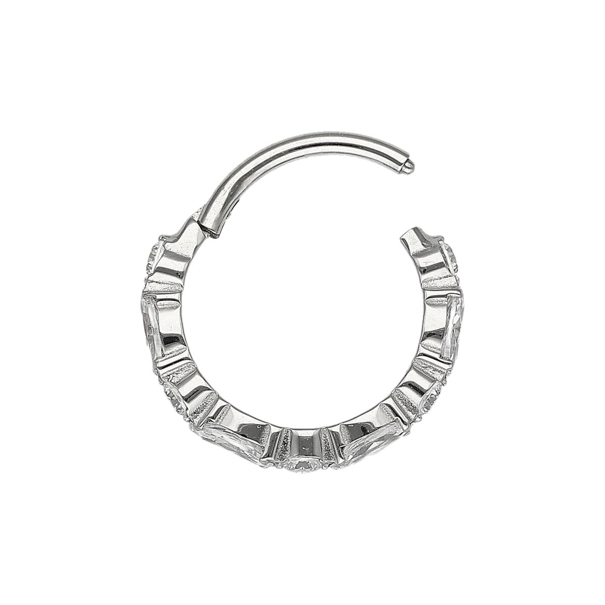 Segmentring/clicker in chirurgisch staal bedekt met witte kristallen